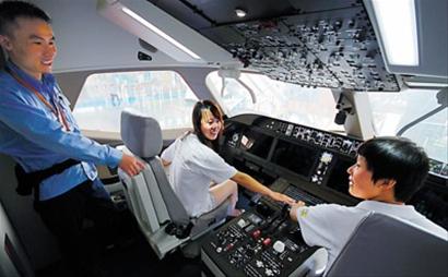 鄉(xiāng)村教師孫云霞、孫鳳霞在國產大飛機樣機機艙內體驗駕駛操作。 徐瑞哲 攝