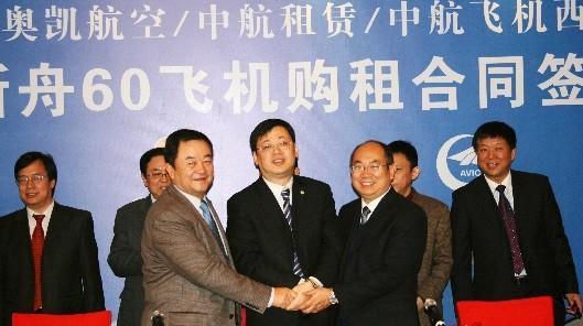 2013年1月18日,奧凱航空與中航國(guó)際租賃公司、西安飛機(jī)國(guó)際航空制造股份有限公司在北京簽署3架新舟60飛機(jī)購(gòu)租合同。奧凱航空總裁劉偉寧;西飛集團(tuán)公司總經(jīng)理、黨委書(shū)記、中航飛機(jī)西飛黨委書(shū)記宋水云;中航租賃總經(jīng)理趙宏偉等領(lǐng)導(dǎo)在購(gòu)租合同上簽字。