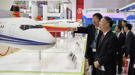 在中國商飛公司展區(qū),蘇波認(rèn)真察看了C919大型客機混合級布局以及ARJ21-700飛機混合級、全經(jīng)濟級、行政機和公務(wù)機布局模型,聽取了公司兩大型號的最新研制進展、能力建設(shè)、人才隊伍建設(shè)、國際合作、民機產(chǎn)業(yè)體系建設(shè)等方面情況的匯報。蘇波表示,中國商飛公司成立5年來取得的成績令人鼓舞,工信部將一如既往地支持中國商飛公司的發(fā)展建設(shè),希望中國商飛公司再接再厲、奮力拼搏,爭取早日取得大型客機項目的成功。