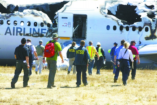 美國國家運輸安全委員會調(diào)查人員在事故現(xiàn)場檢查飛機殘骸。