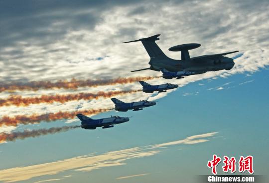 國產(chǎn)預(yù)警飛機(jī)經(jīng)過嚴(yán)格試飛定型后,裝備部隊(duì)并參與執(zhí)行新中國成立60周年大閱兵任務(wù)。圖為預(yù)警機(jī)和護(hù)衛(wèi)飛機(jī)進(jìn)行飛行編隊(duì)訓(xùn)練!∽T超 攝