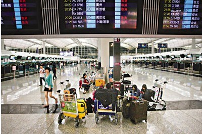香港機(jī)場(chǎng)更陷入癱瘓狀態(tài),截至22日晚9時(shí),共有370班客機(jī)取消,76班客機(jī)延誤。雖然國(guó)泰及港龍航空早在30小時(shí)前,于臺(tái)風(fēng)到達(dá)香港范圍前一日,已宣布取消22日下午6時(shí)后所有航班,但在機(jī)場(chǎng)離境大堂內(nèi)仍有大量旅客等候辦理候補(bǔ)機(jī)位,希望盡快離港。