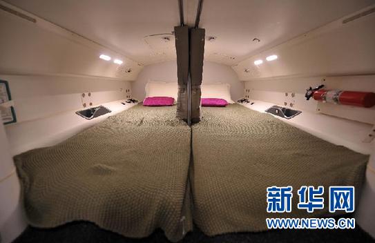 這是飛機內(nèi)的機組人員休息室(12月9日攝)。 12月9日,波音787“夢想”飛機飛抵?诿捞m國際機場,開始為期2天的全球巡展?谡净顒印4饲安ㄒ艄居12月4日在北京啟動了787飛機全球巡展“夢想之旅”,之后將于11日飛赴非洲。波音787可搭載乘客210至250名,航程達14200至15200千米,飛行速度0.85馬赫。 新華社記者 郭程攝