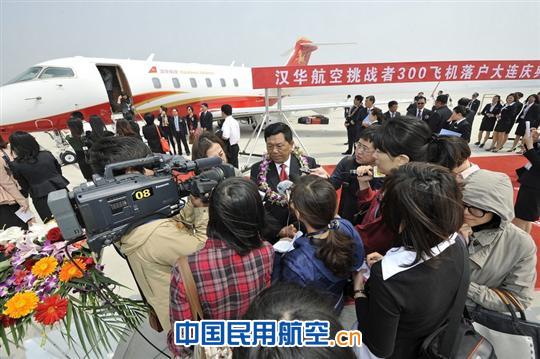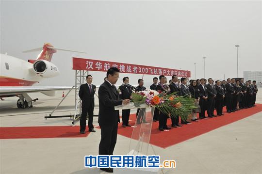 上圖為:漢華航空首架挑戰(zhàn)者300飛機(jī)落戶大連儀式現(xiàn)場