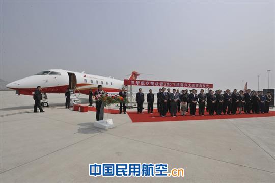 在歡迎儀式上,漢華公務(wù)機(jī)航空有限公司總裁楊建新、大連國際機(jī)場集團(tuán)有限公司副總經(jīng)理杜志淵、大連港口口岸局局長高連分別致辭。楊建新總裁對各位來賓的光臨表示了熱烈的歡迎和衷心的感謝,漢華公務(wù)機(jī)航空有限公司首架挑戰(zhàn)者300型飛機(jī)的成功引進(jìn)并正式落戶大連,得到了民航東北地區(qū)管理局、大連市人民政府以及大連國際機(jī)場和其他各有關(guān)方面的大力支持協(xié)助,首架飛機(jī)的入列,標(biāo)志著漢華公務(wù)機(jī)航空有限公司進(jìn)入了新的發(fā)展階段,飛機(jī)投入運(yùn)營后,公司將始終不渝地堅持“安全第一,預(yù)防為主,綜合治理”的指導(dǎo)思想,堅持高起點、高標(biāo)準(zhǔn)、嚴(yán)要求,確保飛行安全,努力將漢華航空打造成中國一流公務(wù)機(jī)航空服務(wù)品牌。大連市港口口岸局局長高連在致辭中對漢華航空首架飛機(jī)的成功引進(jìn)表示熱烈的祝賀,對楊建新總裁為首的接機(jī)人員表示親切慰問,衷心希望漢華航空以此為起點,不斷加強(qiáng)企業(yè)管理,苦練內(nèi)功,努力創(chuàng)造新的輝煌,將漢華航空打造成為大連市的一張靚麗的名片,為促進(jìn)東北亞航運(yùn)中心建設(shè)和帶動其他產(chǎn)業(yè)發(fā)展作出應(yīng)有的貢獻(xiàn)。大連國際機(jī)場集團(tuán)有限公司副總經(jīng)理杜志淵在致辭中指出,漢華航空引進(jìn)的首架挑戰(zhàn)者300型飛機(jī)也是首架正式落戶大連的公務(wù)機(jī),是大連國際機(jī)場的一件大事,機(jī)場方面將不斷完善公務(wù)機(jī)運(yùn)行服務(wù)保障工作,為航空公司的安全運(yùn)營積極創(chuàng)造有利的環(huán)境和條件。