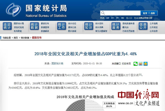 經(jīng)濟日報-中國經(jīng)濟網(wǎng)北京1月21日訊 1月21日,國家統(tǒng)計局發(fā)布2018年全國文化及相關(guān)產(chǎn)業(yè)增加值相關(guān)數(shù)據(jù)。據(jù)經(jīng)濟日報-中國經(jīng)濟網(wǎng)文化產(chǎn)業(yè)頻道(微信號:cewenhua)了解,經(jīng)核算,2018年全國文化及相關(guān)產(chǎn)業(yè)增加值為41171億元,占GDP的比重為4.48%,比上年提高0.22個百分點。>>>更多政策可查看中國經(jīng)濟網(wǎng)“中國文化產(chǎn)業(yè)政策庫”