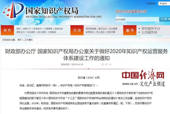 財政部辦公廳 國家知識產(chǎn)權(quán)局辦公室關(guān)于做好2020年知識產(chǎn)權(quán)運營服務體系建設工作的通知
