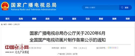 經(jīng)濟日報-中國經(jīng)濟網(wǎng)北京8月5日訊 中國經(jīng)濟網(wǎng)文化產(chǎn)業(yè)頻道記者從國家廣播電視總局官網(wǎng)獲悉,《國家廣播電視總局辦公廳關于2020年6月全國國產(chǎn)電視動畫片制作備案公示的通知》(簡稱《通知》)于4日發(fā)布?!锻ㄖ访鞔_,2020年6月,經(jīng)備案公示的全國國產(chǎn)電視動畫片為53部,19934分鐘。