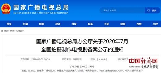 經(jīng)濟(jì)日?qǐng)?bào)-中國經(jīng)濟(jì)網(wǎng)北京8月10日訊 近日,國家廣播電視總局公布7月份全國拍攝制作電視劇備案公示情況,據(jù)悉,2020年7月,全國電視劇拍攝制作備案公示的劇目共49部、1640集。