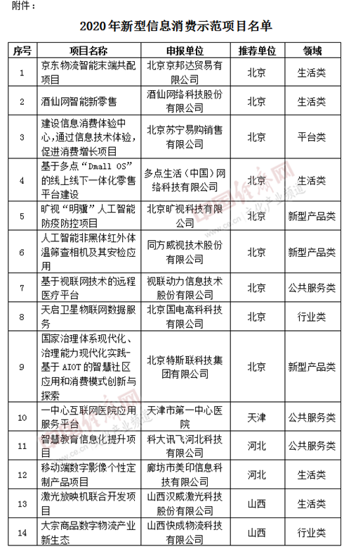 經(jīng)濟(jì)日報-中國經(jīng)濟(jì)網(wǎng)北京8月11日訊 日前,工業(yè)和信息化部公示了2020年新型信息消費(fèi)示范項目,共100個項目入選。