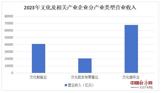 分產業(yè)類型看,文化制造業(yè)實現(xiàn)營業(yè)收入40962億元,比上年增長0.6%;文化批發(fā)和零售業(yè)20814億元,增長6.1%;文化服務業(yè)67739億元,增長14.1%。