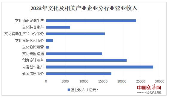 分行業(yè)類別看,新聞信息服務實現(xiàn)營業(yè)收入17243億元,比上年增長15.5%;內容創(chuàng)作生產28262億元,增長10.7%;創(chuàng)意設計服務21249億元,增長8.7%;文化傳播渠道14797億元,增長11.9%;文化投資運營669億元,增長24.4%;文化娛樂休閑服務1758億元,增長63.2%;文化輔助生產和中介服務15468億元,增長0.4%;文化裝備生產6282億元,下降2.6%;文化消費終端生產23787億元,增長3.3%。