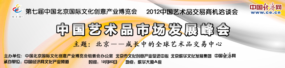 目前,北京藝術(shù)品市場在全球格局中將處于怎樣的定位?藝術(shù)品的稅收問題如何解決?中國藝術(shù)品經(jīng)營及研究機構(gòu)面臨哪些機遇和挑戰(zhàn)?文化保稅區(qū)的政策優(yōu)勢如何能促進北京藝術(shù)品交易市場的發(fā)展?作為2012第七屆中國北京國際文化創(chuàng)意產(chǎn)業(yè)博覽會重要的活動之一,由北京文化創(chuàng)意產(chǎn)業(yè)促進中心、北京歌華文化發(fā)展集團和中國經(jīng)濟網(wǎng)共同主辦,中國經(jīng)濟網(wǎng)文化產(chǎn)業(yè)頻道承辦的“2012中國藝術(shù)品市場發(fā)展峰會”將于12月在北京舉行,特邀請政府相關(guān)部門及各方人士針對目前北京藝術(shù)品市場發(fā)展現(xiàn)狀和發(fā)展趨勢進行直接的交流對話。
