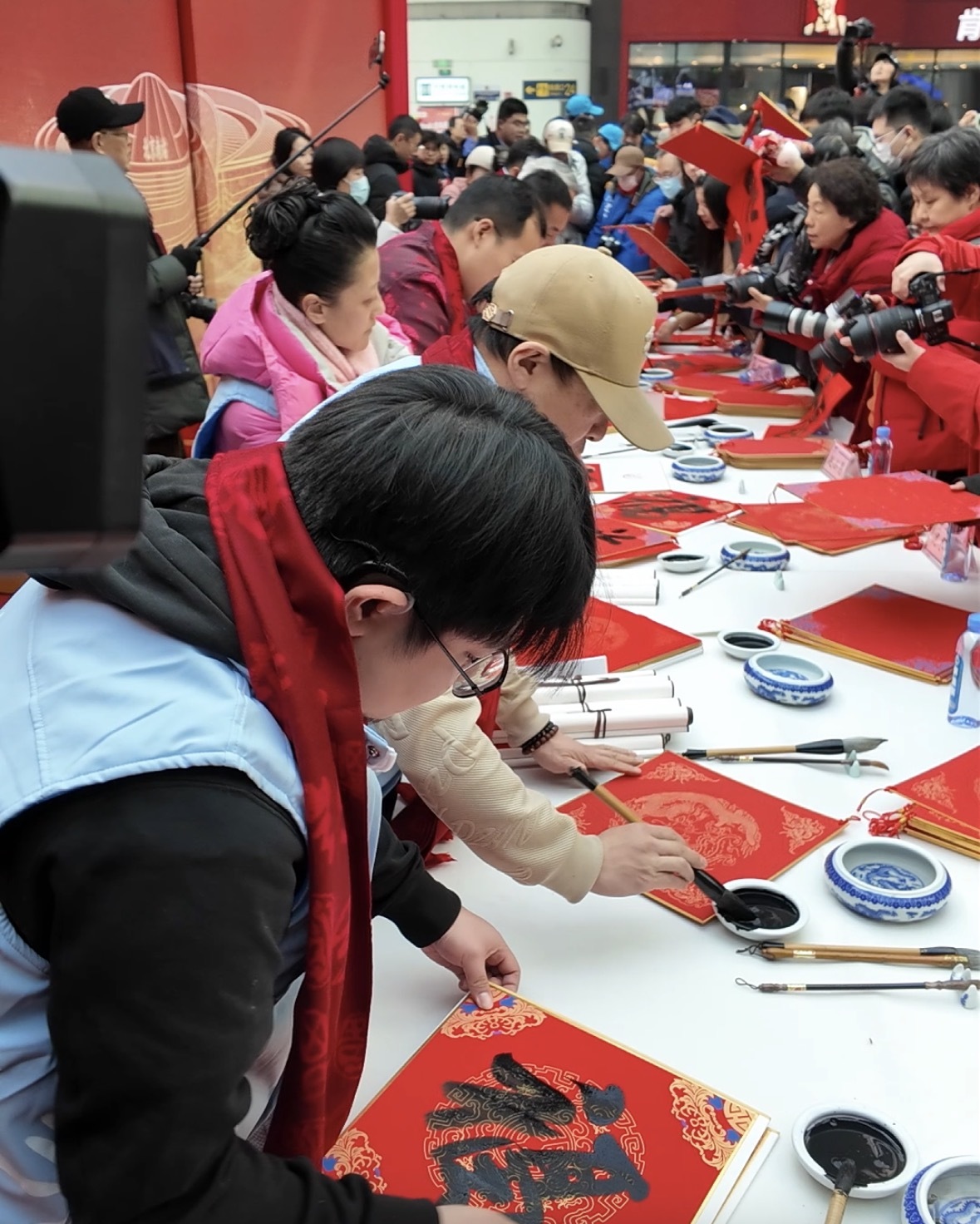 “旅途賀新春、溫暖回家路”春運(yùn)送溫暖文明實(shí)踐活動(dòng)在北京南站候車(chē)大廳上演。書(shū)法家們?yōu)槁每蜁?shū)寫(xiě)福字。中國(guó)經(jīng)濟(jì)網(wǎng)記者鞠然/攝