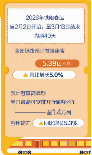 2026年鐵路春運(yùn)自2月2日開(kāi)始,至3月13日結(jié)束,為期40天,全國(guó)鐵路預(yù)計(jì)發(fā)送旅客5.39億人次、同比增長(zhǎng)5.0%,節(jié)前客流高峰日預(yù)計(jì)為2月13日(農(nóng)歷臘月廿六),節(jié)后客流高峰日預(yù)計(jì)為2月23日(農(nóng)歷正月初七)。