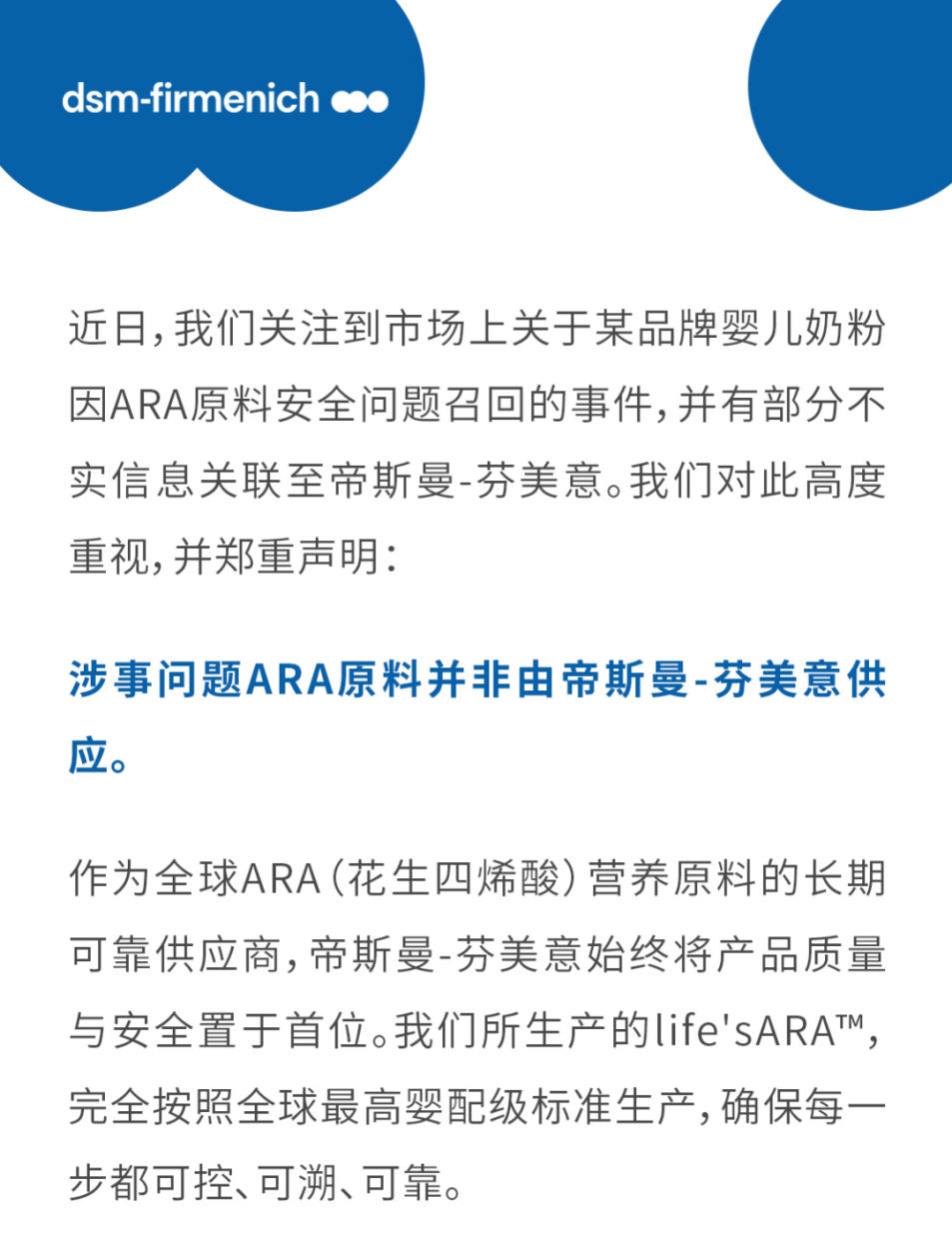 1月7日,帝斯曼通過(guò)官方公眾號(hào)發(fā)布聲明稱,涉事問(wèn)題ARA原料并非由帝斯曼-芬美意供應(yīng)。該公司同時(shí)稱,因以上事件影響,其ARA原料需求激增,將全力協(xié)調(diào)產(chǎn)能,滿足市場(chǎng)需求。