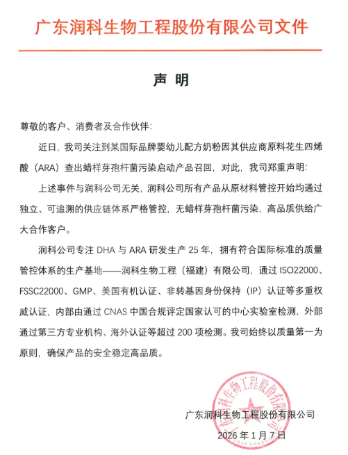 同日,廣東潤(rùn)科生物工程股份有限公司也發(fā)布聲明稱,召回事件與潤(rùn)科公司無(wú)關(guān),潤(rùn)科公司所有產(chǎn)品從原材料管控開始均通過(guò)獨(dú)立、可追溯的供應(yīng)鏈體系嚴(yán)格管控,無(wú)蠟樣芽孢桿菌污染。