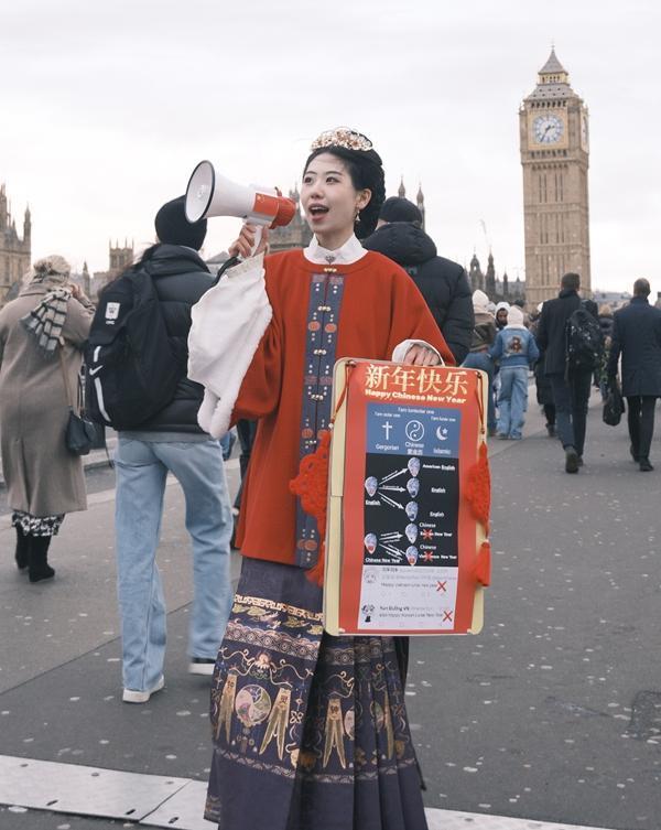 江西女生曹夢竹畢業(yè)于愛丁堡大學,在碩士入學前,她正在度過自己的間隔年,在社交媒體上分享著留學生活的點滴日常。得知申遺成功的消息,她從攝影師朋友那里借來一身紅色的明制漢服,帶著擴音器、媽媽編織的中國結(jié)和春節(jié)文化的宣傳板,來到人山人海的倫敦眼、大本鐘下,“來自世界各地的朋友都會在那兒打卡”。