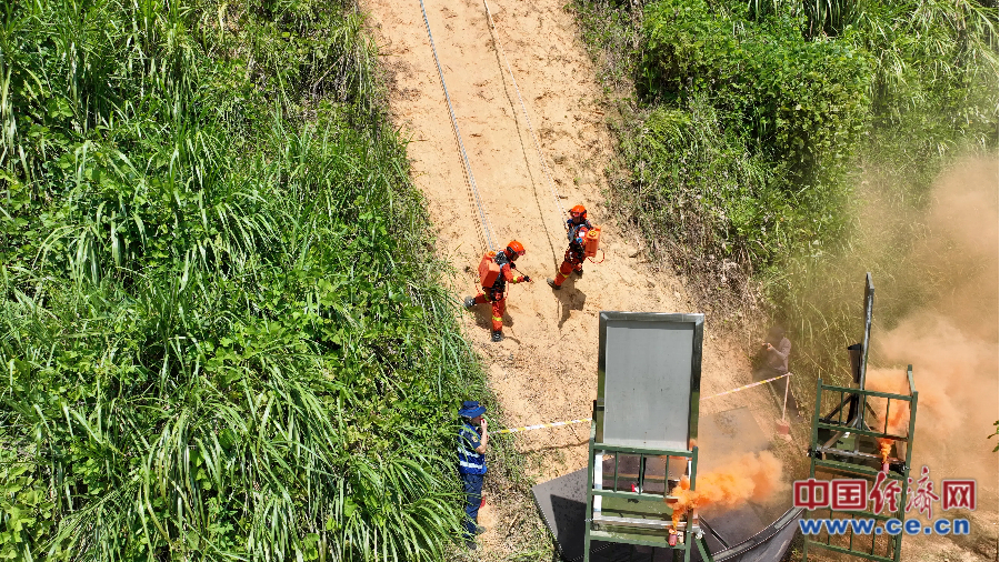 消防員在特殊地形處置煙點。特殊地形煙點處置是指在無法直接接近的陡坡設置模擬煙點(水袋),要求人員協(xié)同利用繩索技術安全抵近煙點進行處置,以輸水時間和組織的安全性綜合評定成績,檢驗特殊地形條件下滅火、救援技術結合運用的能力。 李為展/攝