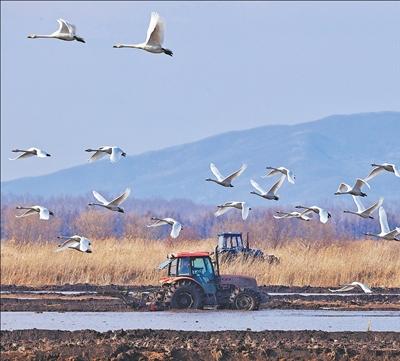 眼下,各地春耕一派繁忙。在黑龍江省同江市的一處水田里,正在作業(yè)的農(nóng)機和起飛的天鵝同框,構(gòu)成一幅靈動的春日畫卷。劉萬平攝(新華社發(fā))