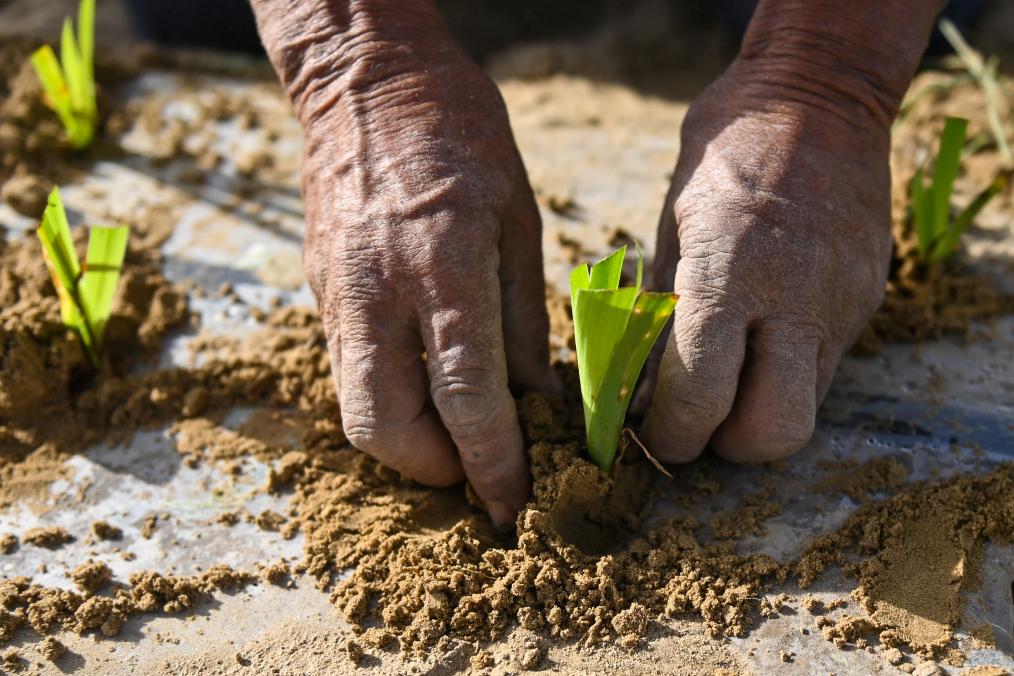 在新疆和田地區(qū)于田縣萬(wàn)花園防沙治沙示范區(qū),當(dāng)?shù)卮迕裨谠苑N射干(4月15日攝)。新華社記者 丁磊 攝