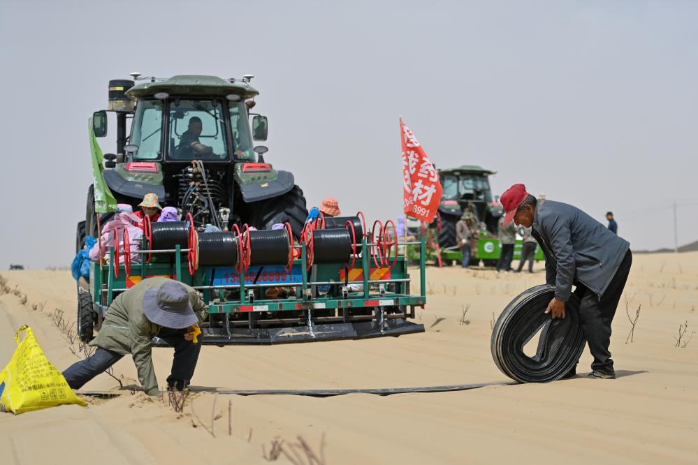 在新疆和田地區(qū)于田縣闐東防沙治沙示范區(qū),當(dāng)?shù)卮迕耨{駛機(jī)械移栽玫瑰和黃芩,并鋪設(shè)滴灌帶(4月15日攝)。 新華社記者 丁磊 攝