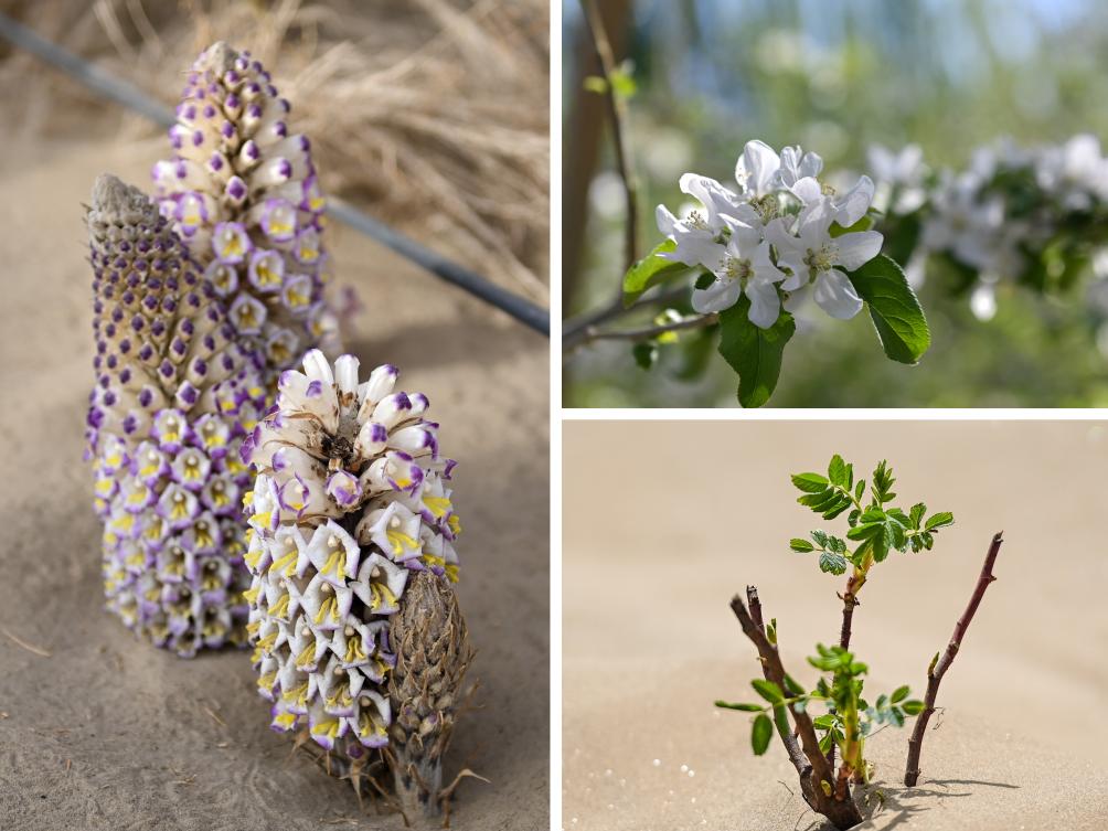 拼版照片:右上為在新疆阿克蘇豐慶園農(nóng)民專(zhuān)業(yè)合作社示范園拍攝的蘋(píng)果花(4月14日攝);右下為在新疆和田地區(qū)于田縣闐東防沙治沙綜合示范區(qū)拍攝的玫瑰花苗(4月15日攝);左為在新疆仙草蓉科技有限公司防沙治沙荒漠植物示范園拍攝的肉蓯蓉(4月13日攝)。新華社記者 丁磊 攝