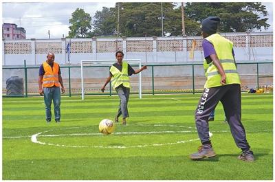 肯尼亞內(nèi)羅畢河流域生態(tài)修復(fù)項(xiàng)目建起足球場(chǎng),為當(dāng)?shù)鼐用裉峁┬蓍e健身設(shè)施。本報(bào)記者 黃煒鑫攝