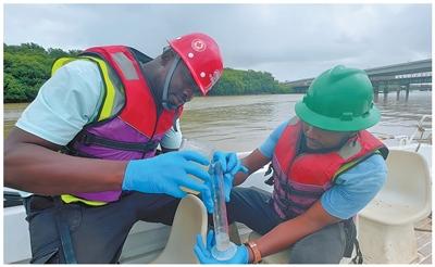 當(dāng)?shù)貑T工在圭亞那新德梅拉拉河大橋旁進(jìn)行水質(zhì)抽樣檢測(cè)?!”緢?bào)拉美中心分社 維娜·甘加丁攝