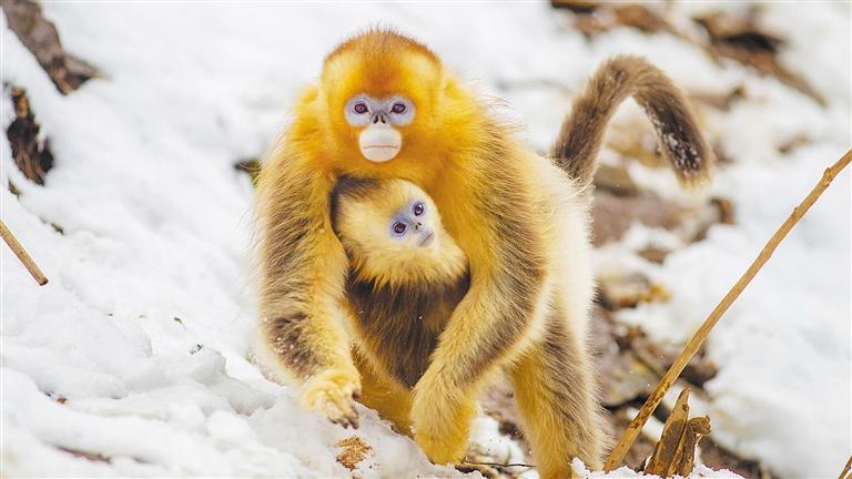 2月24日,四川省綿陽市平武縣黃羊關(guān),川金絲猴母子下山覓食。今年4月22日是第57個世界地球日,活動主題為“珍愛自然資源 守護(hù)美麗中國”。田明章攝(中經(jīng)視覺)