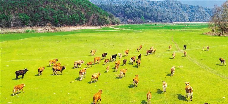 3月10日,江西省泰和縣橋頭鎮(zhèn)南車水庫,成群的黃牛在草地上悠閑覓食。邱聯(lián)桂攝(中經(jīng)視覺)