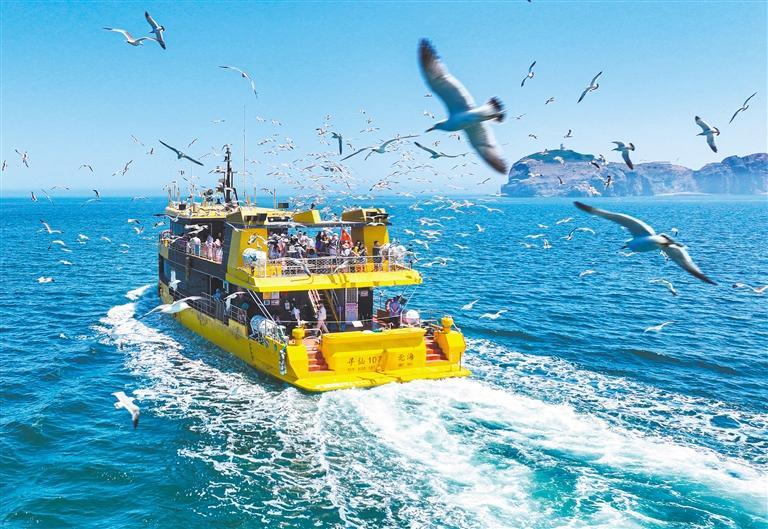 2025年6月23日,山東省榮成市成山鎮(zhèn)北部海域海驢島,游客乘船體驗(yàn)海上游,與黑尾鷗互動。 李信君攝(中經(jīng)視覺)
