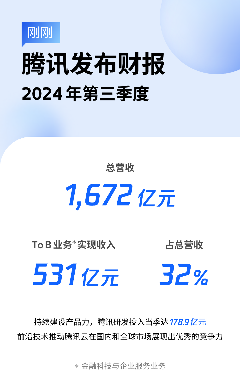 中國(guó)經(jīng)濟(jì)網(wǎng)北京11月14日訊(記者 李方) 11月13日,騰訊發(fā)布2024年Q3財(cái)報(bào),當(dāng)季度騰訊總營(yíng)收1672億元,同比增長(zhǎng)8%。騰訊ToB業(yè)務(wù)(金融科技及企業(yè)服務(wù))實(shí)現(xiàn)營(yíng)收531億元,占騰訊總營(yíng)收的32%。其中,企業(yè)服務(wù)的收入增長(zhǎng)受益于云服務(wù)和商家技術(shù)服務(wù)費(fèi)推動(dòng),毛利受益于結(jié)構(gòu)優(yōu)化、效率提升獲得顯著增長(zhǎng)。