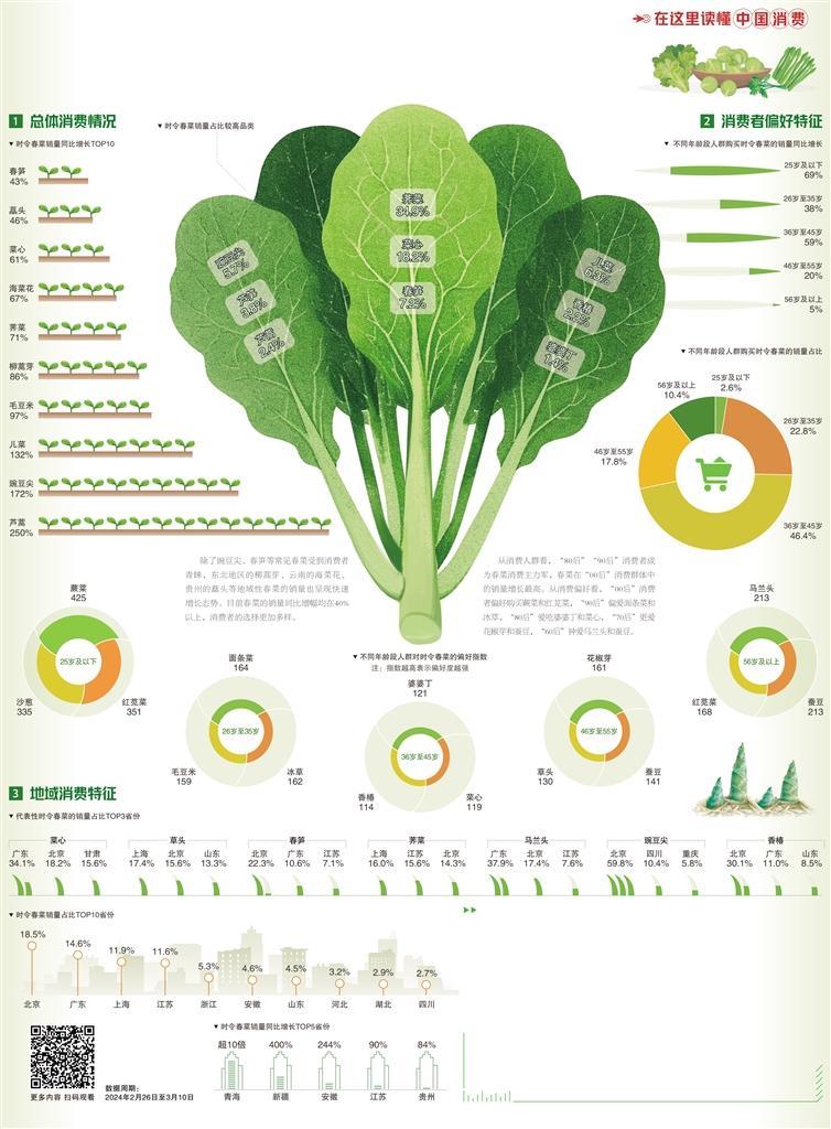 有趣的是,春菜消費(fèi)也呈現(xiàn)出顯著的地域偏好特征。上海消費(fèi)者最愛選購草頭、薺菜,酒香草頭、薺菜餛飩是春日餐桌上的心頭好;川渝消費(fèi)者尤為鐘愛鮮嫩可口的豌豆尖和氣味獨(dú)特的折耳根;北京消費(fèi)者最愛香椿,同時(shí)春筍、蠶豆等也是餐桌上不可或缺的美味;廣東消費(fèi)者最愛的春菜當(dāng)屬菜心;對于江浙地區(qū)的消費(fèi)者而言,他們最喜歡選購春筍、馬蘭頭、薺菜、蘆筍等。