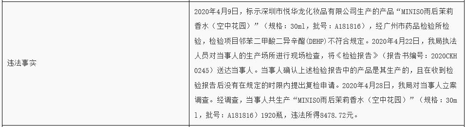 廣東省藥品監(jiān)督管理局官網(wǎng)公布的行政處罰決定書顯示,2020年4月9日,標(biāo)示深圳市悅?cè)A龍化妝品有限公司生產(chǎn)的產(chǎn)品“MINISO雨后茉莉香水(空中花園)”(規(guī)格:30ml,批號:A181816),經(jīng)廣州市藥品檢驗所檢驗,檢驗項目鄰苯二甲酸二異辛酯(DEHP)不符合規(guī)定。