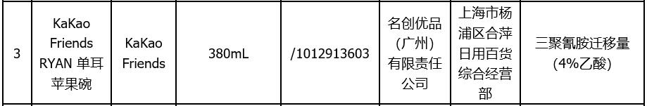 今年6月,上海市市場監(jiān)管局網(wǎng)站發(fā)布的《2019年上海市兒童用餐具(密胺餐具)質(zhì)量監(jiān)督抽查結(jié)果》顯示,標(biāo)稱名創(chuàng)優(yōu)品(廣州)有限責(zé)任公司生產(chǎn)的標(biāo)稱KaKao Friends RYAN 單耳蘋果碗(規(guī)格型號:380mL)被檢出三聚氰胺遷移量(4%乙酸)項目不合格。