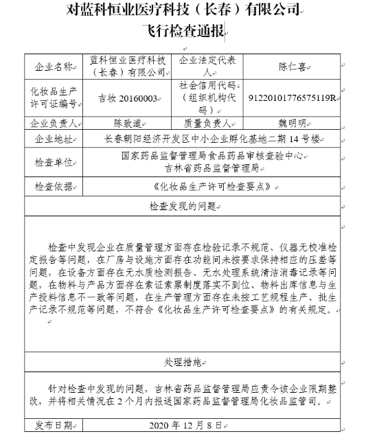 針對檢查中發(fā)現(xiàn)的問題,國家藥監(jiān)局要求吉林省藥品監(jiān)督管理局應責令該企業(yè)限期整改,并將相關情況在2個月內(nèi)報送國家藥品監(jiān)督管理局化妝品監(jiān)管司。