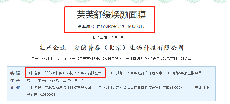 記者了解到,藍科恒業(yè)醫(yī)療科技(長春)有限公司是芙芙舒緩煥顏面膜、芙芙深澈潤顏面膜、芙芙抑痘凈顏面膜、芙芙清痘復顏面膜等產(chǎn)品的生產(chǎn)企業(yè)。其中芙芙舒緩煥顏面膜在網(wǎng)購平臺上芙芙官方旗艦店總銷售量達54萬。