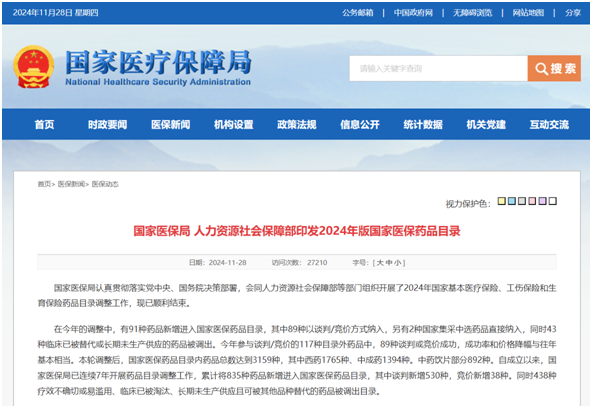 2024年醫(yī)保目錄調(diào)整從7月1日正式啟動,是國家醫(yī)保局成立以來的第7次國家醫(yī)保藥品目錄調(diào)整,將于2025年1月1日起實施。發(fā)布會上,國家醫(yī)保局醫(yī)藥服務(wù)管理司司長黃心宇介紹,今年目錄調(diào)整范圍以新藥為主,新增的91種藥品中有90種為5年內(nèi)新上市品種。國家醫(yī)保局將包括1類化藥、1類治療用生物制品、1類和3類中成藥在內(nèi)的“全球新”作為重點支持對象,確?!昂娩撚迷诘度猩稀?。