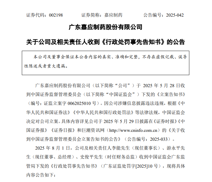 中國(guó)證監(jiān)會(huì)廣東監(jiān)管局認(rèn)為,嘉應(yīng)制藥的上述行為涉嫌違反了《中華人民共和國(guó)證券法》(以下簡(jiǎn)稱《證券法》)第七十八條第一款、第八十條第一款和第二款第三項(xiàng)的規(guī)定,構(gòu)成《證券法》第一百九十七條第一款所述違法行為。嘉應(yīng)制藥涉案期間有關(guān)董事、高級(jí)管理人員涉嫌違反了《證券法》第八十二條第三款的規(guī)定,構(gòu)成《證券法》第一百九十七條第一款所述“直接負(fù)責(zé)的主管人員和其他直接責(zé)任人員”。