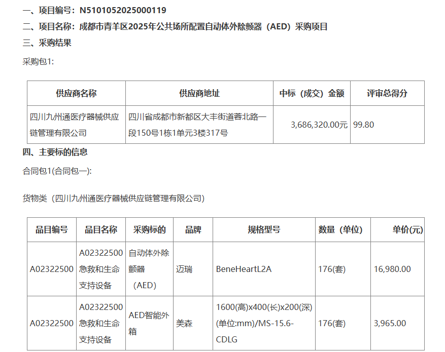公告顯示,四川九州通醫(yī)療器械供應(yīng)鏈管理有限公司以99.80的評審總得分中標(biāo),中標(biāo)(成交)金額為3686320.00元,將供應(yīng)176(套)邁瑞公司的自動(dòng)體外除顫器(AED),單價(jià)為16980.00元;供應(yīng)176(套)美森公司的AED智能外箱,單價(jià)為3965.00元。