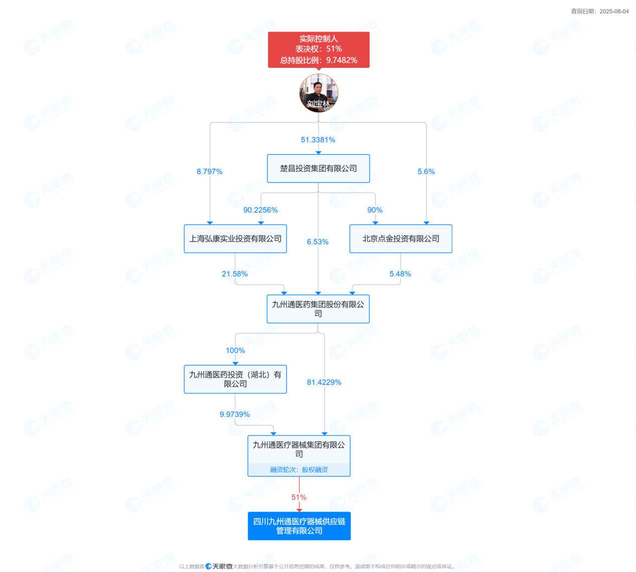 天眼查顯示,四川九州通醫(yī)療器械供應(yīng)鏈管理有限公司成立于2023年,注冊資本6000萬元,是九州通醫(yī)藥集團(tuán)股份有限公司孫公司,也系楚昌投資集團(tuán)成員。