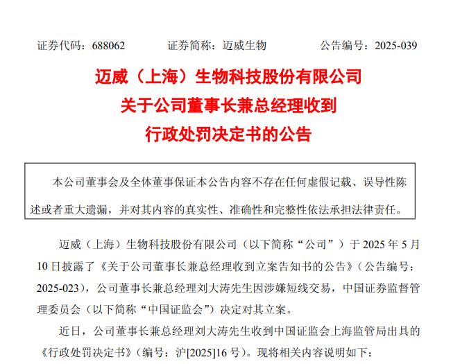 中國(guó)經(jīng)濟(jì)網(wǎng)北京8月7日訊(記者 郭文培)8月5日,邁威(上海)生物科技股份有限公司(以下簡(jiǎn)稱邁威生物)披露公告,由于短線交易,近日公司董事長(zhǎng)兼總經(jīng)理劉大濤收到中國(guó)證監(jiān)會(huì)上海監(jiān)管局出具的《行政處罰決定書(shū)》,劉大濤被警告并處以六十萬(wàn)元罰款。