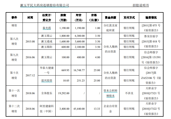 “V觀財報”查閱漱玉平民招股書發(fā)現(xiàn),2018年6月,漱玉平民股東大會通過決議,同意將注冊資本增加至36480萬元。新增的注冊資本3408萬元由阿里健康以45440萬元認繳,全部為貨幣出資。本次增資的價格為13.33元/股。