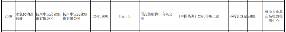 通告顯示,經(jīng)佛山市食品藥品檢驗(yàn)檢測(cè)中心檢驗(yàn),揚(yáng)州中寶藥業(yè)股份有限公司生產(chǎn)的濃氯化鈉注射液(批號(hào):324102601)不符合規(guī)定,不合格項(xiàng)目為PH值。