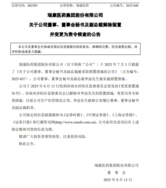 中國(guó)經(jīng)濟(jì)網(wǎng)北京8月15日訊(記者 郭文培)8月13日,瑞康醫(yī)藥集團(tuán)股份有限公司(以下簡(jiǎn)稱瑞康醫(yī)藥)披露公告稱,公司收到濟(jì)南市濟(jì)陽區(qū)監(jiān)察委員會(huì)簽發(fā)的《變更留置通知書》,濟(jì)南市濟(jì)陽區(qū)監(jiān)察委員會(huì)已解除對(duì)公司董事、董事會(huì)秘書及副總裁李喆的留置措施,變更為責(zé)令候查措施。