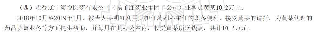 根據(jù)判決書,2018年10月至2019年1月,被告人某明紅利用其擔(dān)任藥劑科主任的職務(wù)便利,接受遼寧海悅醫(yī)藥有限公司(揚(yáng)子江藥業(yè)集團(tuán)子公司)業(yè)務(wù)員黃某的請托,為黃某代理的藥品協(xié)調(diào)業(yè)務(wù)等方面提供幫助,并每月在其辦公室內(nèi),收受黃某所送錢款,共計(jì)10.2萬元。