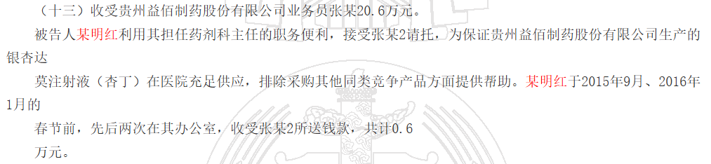 記者檢索中國裁判文書網(wǎng)發(fā)現(xiàn),此摘錄文章源自《某明紅受賄一審刑事判決書》。此判決書顯示,貴州益佰制藥股份有限公司業(yè)務員涉其中。