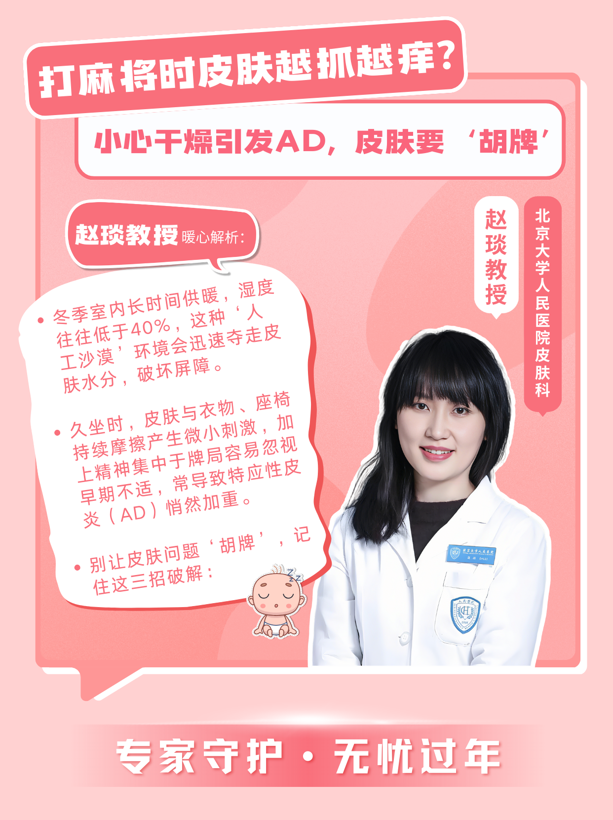 “嬰幼兒特應(yīng)性皮炎(AD)在冬季高發(fā),孩子無法清晰表達(dá)‘癢’,只能通過蹭、抓等動作緩解不適,家人常誤認(rèn)為是親昵或調(diào)皮。春節(jié)期間環(huán)境變化易誘發(fā)病情加重,家長無需過度焦慮,記住三點科學(xué)護(hù)理,孩子就能舒適過年: