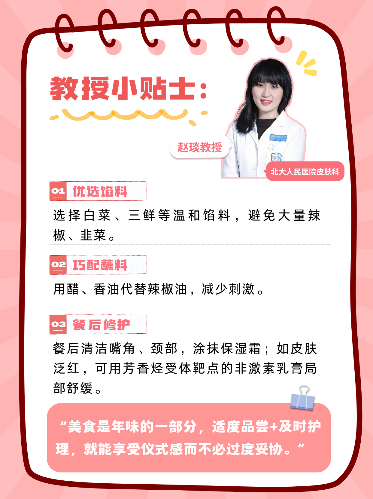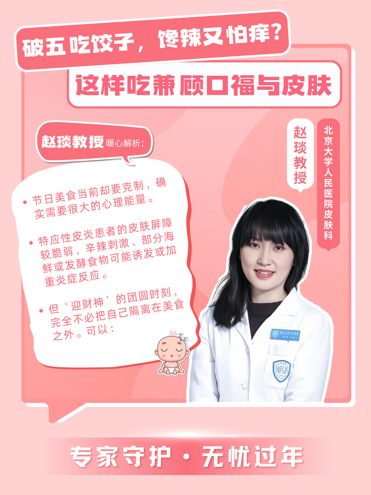 “節(jié)日美食當(dāng)前卻要克制,確實需要很大的心理能量。特應(yīng)性皮炎患者的皮膚屏障較脆弱,辛辣刺激、部分海鮮或發(fā)酵食物可能誘發(fā)或加重炎癥反應(yīng)。但‘迎財神’的團(tuán)圓時刻,完全不必把自己隔離在美食之外?!笨梢裕?/p>